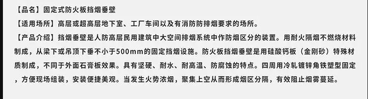 1.固定式:采用挡烟布式各种防火,挡烟材料制作固定在建筑顶棚下或屋梁下,垂壁高度500mm~800mm。