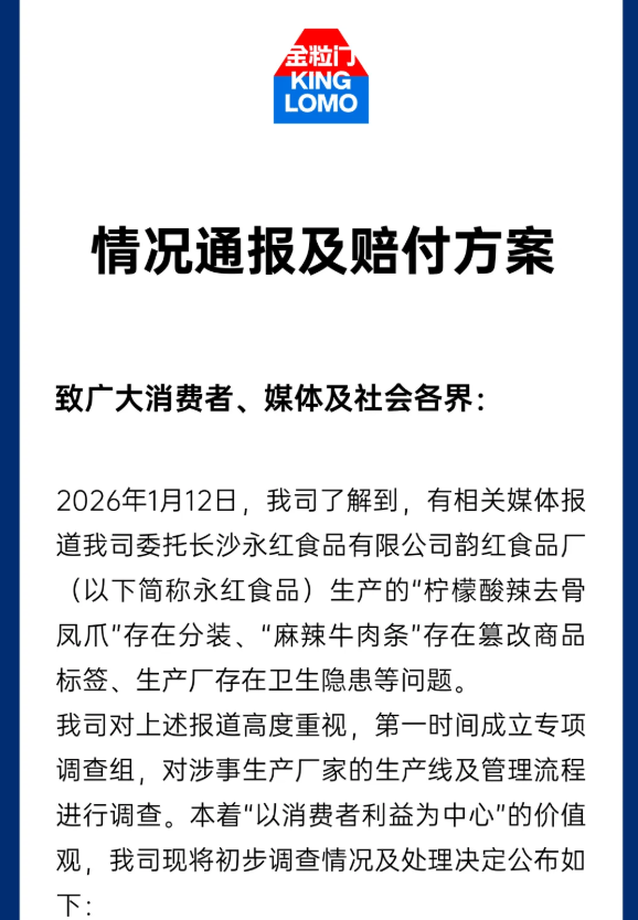 就在门店回应各异的当天,金粒门通过关联公司湖南进化者食品有限公司发布官方通报,就代工厂问题致歉,并公布具体赔付及整改方案,试图平息舆论。