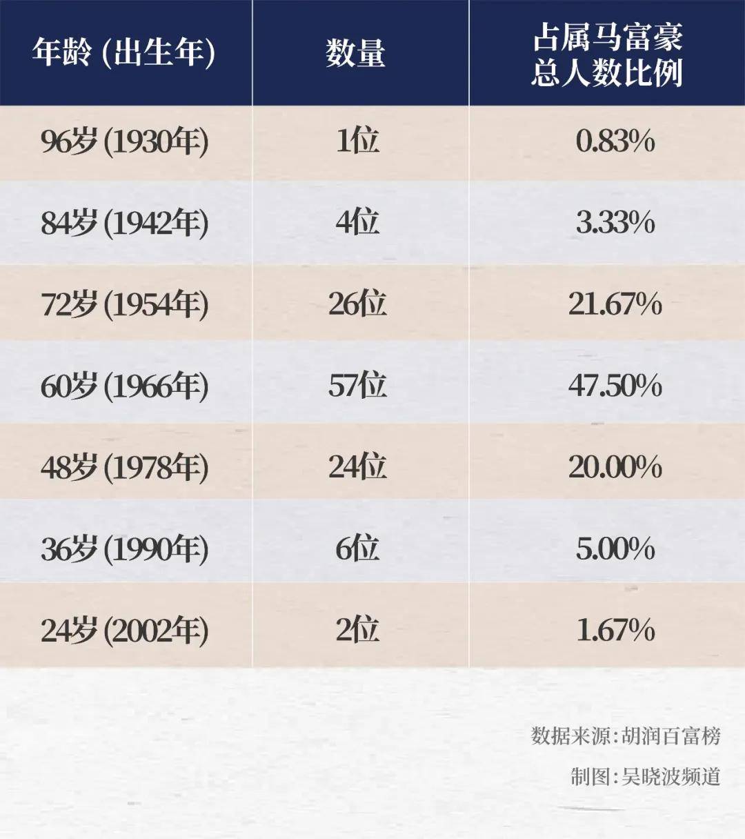 他们赶上了第二波婴儿潮,其青壮年时期恰与中国市场化改革、全球化及互联网浪潮高度重合。当“胆子再大一点”的时代先声划破沉闷,这些身兼知识储备与野心的奋斗者,便在庞大的人口基数中脱颖而出。婴儿潮决定了企业家池子的规模,改革开放与产业升级则是财富暴涨的引擎。