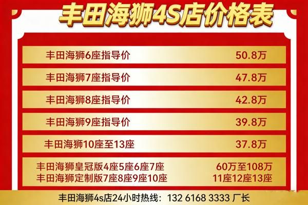 丰田海狮改装销售中心4S店电话,丰田海狮出厂报价丰田海狮4S店价格,目前丰田海狮13座版售价36万元,9座版售价43万元,7座版售价48万元。丰田海狮(6座/7座/8座/9座10座/11座/12座/13座),9座以下丰田海狮可上蓝牌! 质量担保,价格优惠.