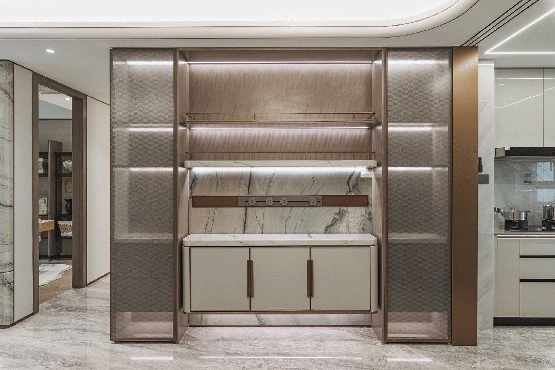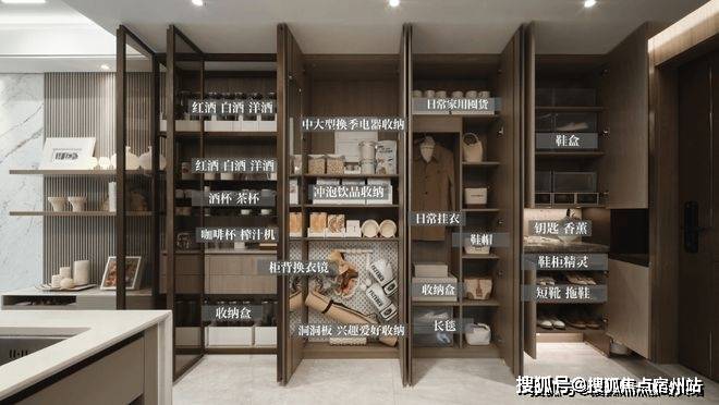 ,为生活扩容,可容纳约56个20寸行李箱,而玄关柜、岛台、卫生间镜柜、主卧衣帽间等空间,