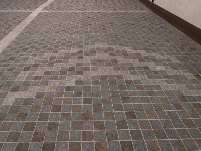 指引箭头与分割线,皆以同厚度的马蹄石精准镶嵌。于沉稳的暗色中勾勒出清晰利落的视觉节奏与秩序。