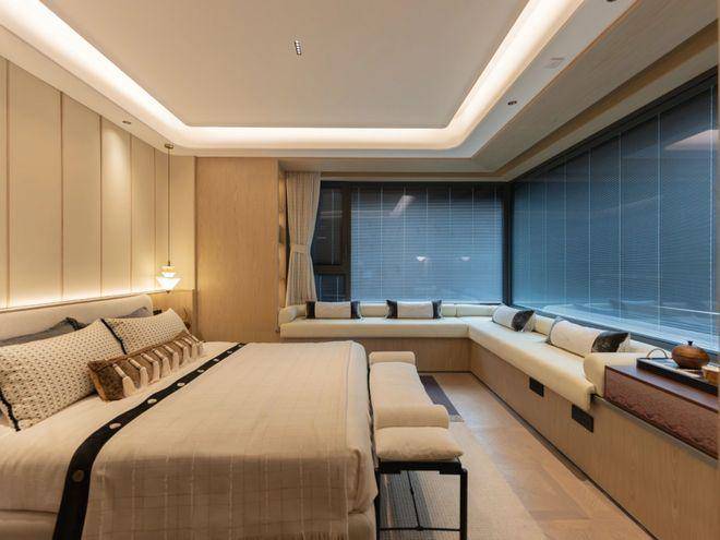 抬眼望去,顶面采用市面超大规格3米长蜂窝铝板+大规格铝方通+贯穿式线型灯带和铝单板,温润大气,营造通透且极具延伸感的视觉景象。