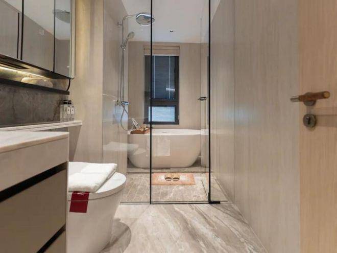 厨房采用博世厨电四件套:三眼灶台、壁挂式侧吸油烟机、15套大容量的洗碗机、大容量的蒸烤一体机。还配备日立厨房空调(具备制冷和制热功能),比市面上普通的凉霸更升一级。