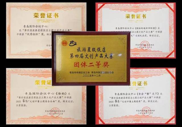 2025年12月,荣获第四届旅游星级饭店主题文创产品大赛 2025最佳“青岛有礼”文创礼品奖、2025最佳“文创中餐主题宴席”奖、2025最佳“文创中餐主题宴会台面”奖、优秀组织奖、团体