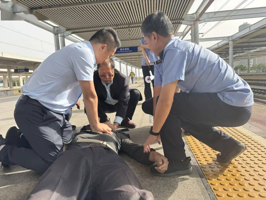5月17日16:40,新乡高铁东站站台突发紧急状况,一名男乘客突然瘫倒在地,陷入昏迷,口中涌出大量分泌物,且无自主呼吸、无脉搏,生命危在旦夕。首都医科大学附属三博脑科医院原党委书记、新乡医学院麻醉学院名誉院长王保国教授迅速判断患者已心脏骤停,立即跪地实施心肺复苏,持续进行胸外按压。此时,乡医学院第一附属医院党委书记宋元明在现场协调并拨通了救援电话,多人联手成功将患者从死神手中夺回。