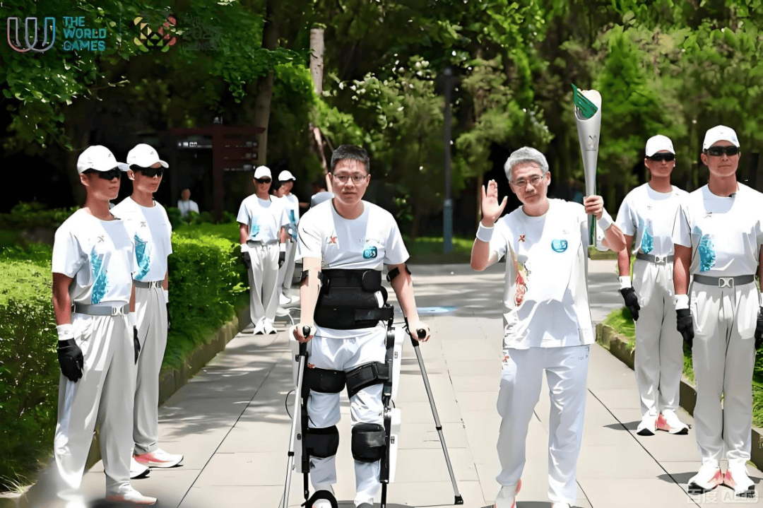 成都市残疾人林寒(下肢瘫痪)穿戴布法罗机器人科技公司自主研制的外骨骼机器人,与公司创始人程洪教授共同完成2025年第12届世界运动会火炬传递