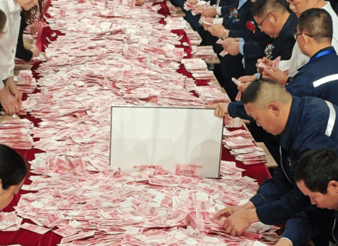 年会现场专门摆放了40台点钞机,为数钱环节提供辅助。百元大钞在长桌上铺满,一线员工代表在一旁蓄势待发。不同年限的一线分钟三个组别。有人在10分钟内数了9.1万元,有员工表示数钱数到手软。