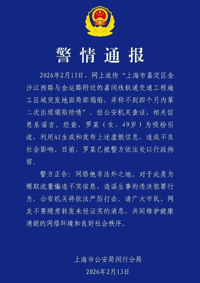 2月13日晚,上海市公安局闵行分局针对此事发布“警情通报”称,经公安机关查证,相关信息系谣言,罗某(女,49岁)为吸粉引流,利用AI生成和发布上述虚假信息,造成不良社会影响,目前已被警方依法处以行政拘留。
