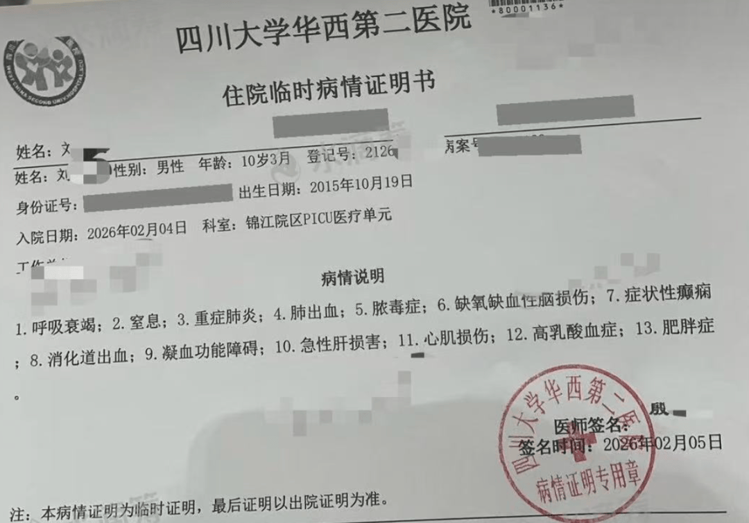 四川大学华西第二医院住院临时病情证明书显示,晓晨被送到医院时出现呼吸衰竭、窒息、重症肺炎、肺出血、脓毒症、缺氧缺血性脑损伤等共13项病症。