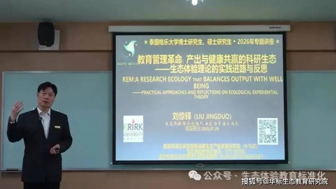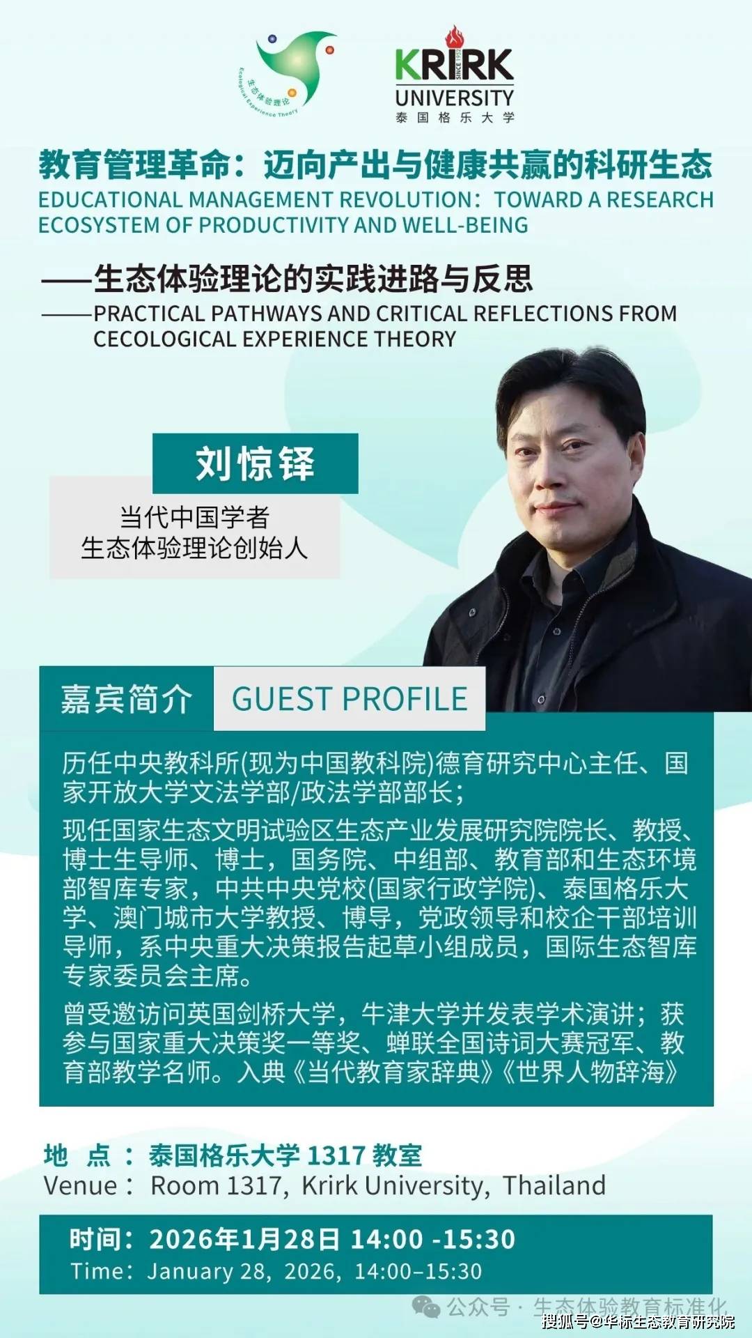 上图为:正值中泰建交五十载的重要时间节点,刘惊铎教授在泰国跨年演讲引起巨大反响。在泰国格乐大学的校园里、学术宣传栏里,师生驻足阅读令人耳目一新的学术讲座海报——主讲人:当代中国学者、生态体验理论创始人刘惊铎教授。讲座题目:《教育管理革命:产出与健康共赢的科研生态——生态体验理论的实践进路与反思》(EMR:a Research Ecology that Balances Output with Well-being——Practical Approaches and Reflections on Ecological Experiential Theory),该演讲向世界传递中国生态之声,直击全球高等教育与科研管理的共性难题。他在主旨演讲中分享了他主导推动的全球“生态体验运动”和“世界人类命运共同体生态圈建设”40多年的大样本实验和实践创新探索经验与理论反思,包括英国皇家院士团队在内世界范围的广大专家学者取得了显著的成效和丰硕的成果,但同时,没有毁伤科学家和教科研人员的身心健康,推动教育管理革命走向产出与健康共赢的科研新生态。(图片来源:泰国格乐大学国际学院、泰国格乐大学教育系信息技术中心)