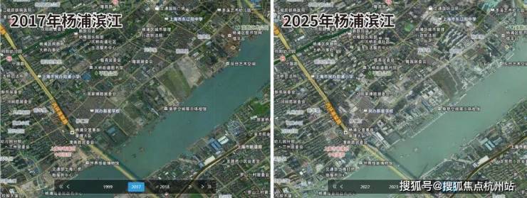 ,让“科创绣带”的定位有了最坚实的实体支撑。作为黄浦江畔的压轴板块,杨浦滨江的建设速度是有目共睹的,下图是2017-2025年杨浦滨江的卫星影像变化图,几乎是一年一个样!